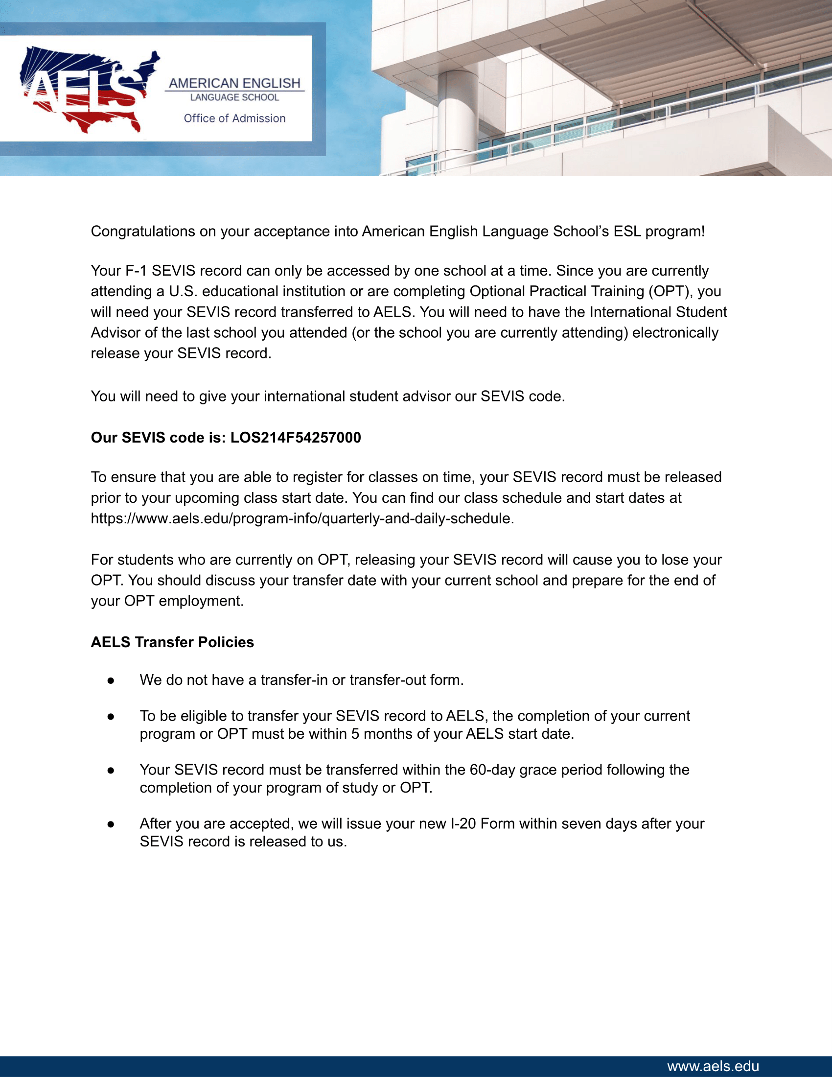 After you have paid your application fees, anticipate receiving your acceptance letter within one week. Once you have received the acceptance letter, kindly provide it to your current school so that they can release your SEVIS record to us before the course start date indicated in the acceptance letter.